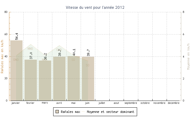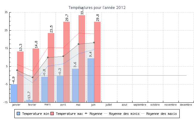| avril | -0.3 °C | 6.5 °C | 29.7 °C | 15.4 °C | 10.5 °C | 5.0 km/h | 39.7 km/h | SSO |